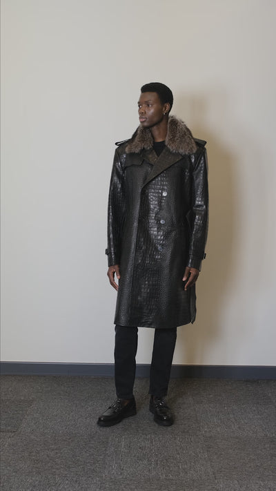 The Aegis Royale Coat is the epitome of luxurious protection and timeless style. Crafted from croco embossed lambskin leather, this coat offers an intricate texture that exudes elegance and strength. The detachable raccoon collar adds a touch of wild sophistication, giving you the versatility to switch up your look with ease. Whether you're braving the cold in the city or making a powerful statement at an event, the Aegis Royale Coat ensures you do so with unmatched poise and confidence.