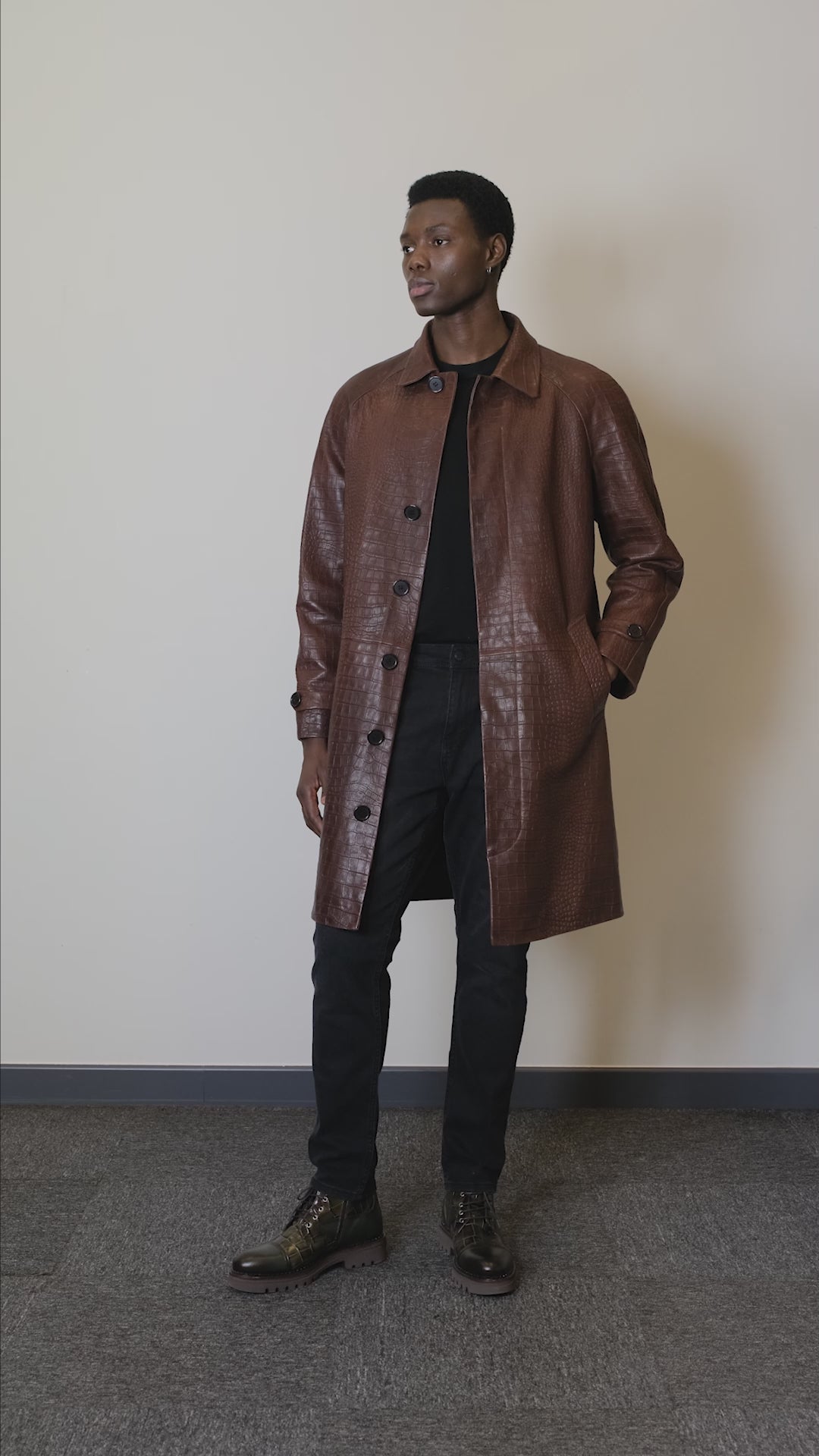 Embody the essence of refined elegance with the Sahara Blaze Trench Coat, a masterpiece crafted from croco embossed lambskin leather. This trench coat's rich, earthy tones evoke the grandeur of desert landscapes, while the intricate croco-embossed texture adds a layer of sophistication and edge. Perfect for those who appreciate timeless style with a modern twist, the Sahara Blaze is the ideal companion for making a bold statement, whether in the boardroom or out on the town.