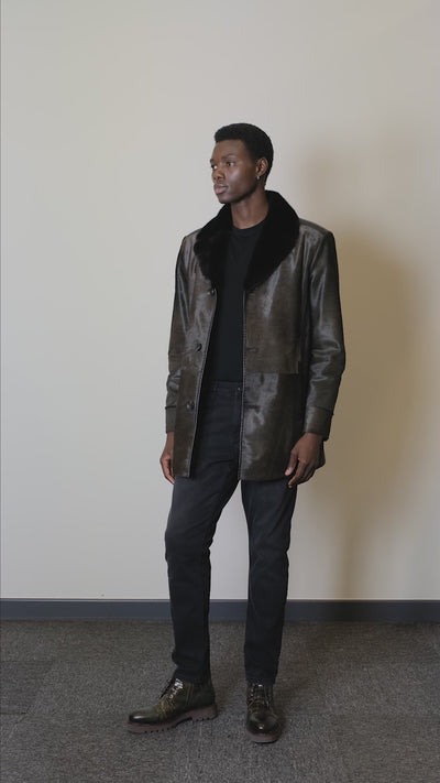 The Helios Radiance Coat is a stunning representation of opulence and meticulous craftsmanship. Made from luxurious Cavallino (hair calf leather) and adorned with a rich Mink collar, this coat exudes a radiant aura that commands attention. The deep, lustrous finish of the Cavallino pairs perfectly with the plush Mink collar, creating a look that is both sophisticated and commanding. Whether you're making an entrance at a formal event or simply stepping out in style, the Helios Radiance Coat is your ultimate statement piece.